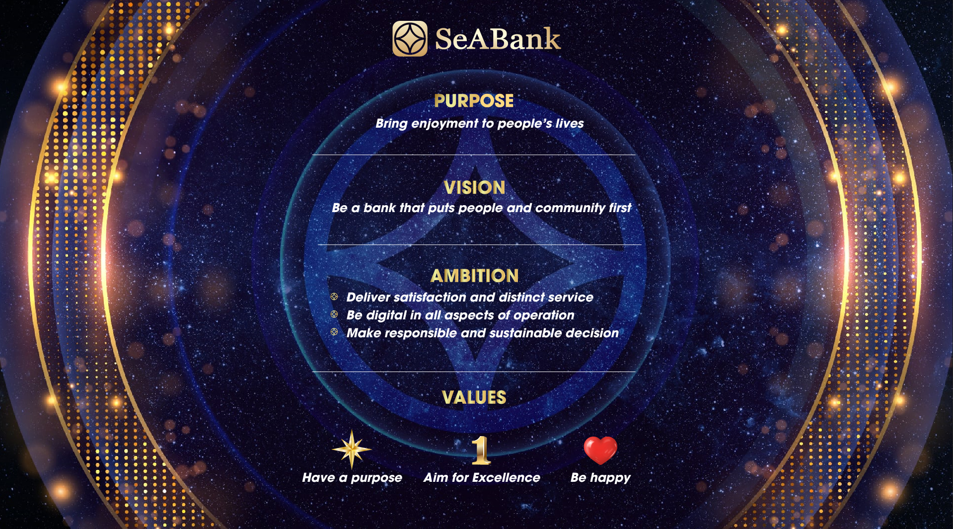With the aim of delivering optimal value and benefits to our valued customers and partners, SeABank consistently drives agile and innovative strategic thinking, aligned with sustainable development. To achieve our established strategic objectives, SeABank hereby officially announces the Strategic Framework on the Bank’s Vision and Core Values, comprising: