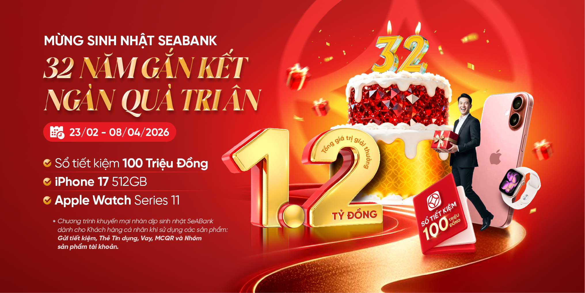 Ngân hàng TMCP Đông Nam Á (SeABank) trân trọng thông báo danh sách mã số may mắn của các khách hàng đã tham gia Chương trình khuyến mại Tết 2026 & sinh nhật ngân hàng 32 năm dành cho Khách hàng cá nhân sử dụng sản phẩm dịch vụ ngân hàng từ ngày 02/02/2026 đến ngày 15/02/2026.