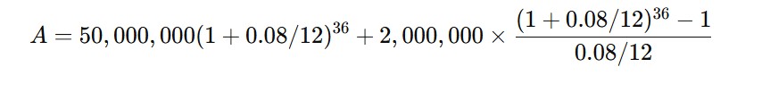 Vế 2: Tổng giá trị của các khoản gửi thêm (2 triệu đồng/tháng) và lãi của phần gửi thêm là: 2,000,000 × [((1 + 0.08/12)^36 - 1) / (0.08/12)] = 2,000,000 × [(1.2702 - 1) / 0.00667] = 2,000,000 × 40.53 ≈ 81,060,000 đồng